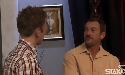 Dominating blonde bangs a dude wearing a diaper then masturbates him off