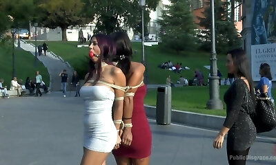 Coral Joice and Julia De Lucia roped up in public with ball gags