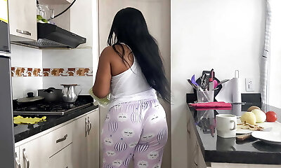 MILF step-mom loves making breakfast and fucking her big cock stepson.