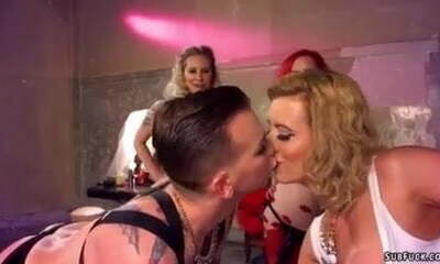 Strapped up sissy dude pounded by dominas
