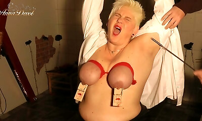 Torment and stretching of pierced nipples with paper clips