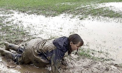 Messy fields, rain suit in the rain