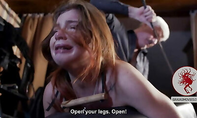Nymph screams with man smashing her pussy in slavery