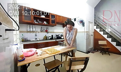 Ravioli Time! A nude housekeeper works in the motel kitchen. Depraved housekeeper works in the kitchen sans panties.