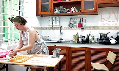 Ravioli Time! Naked Cooking. Regina Noir, a naturist cook at nudist hotel resort. Nude maid. Nude housewife. Camera 1